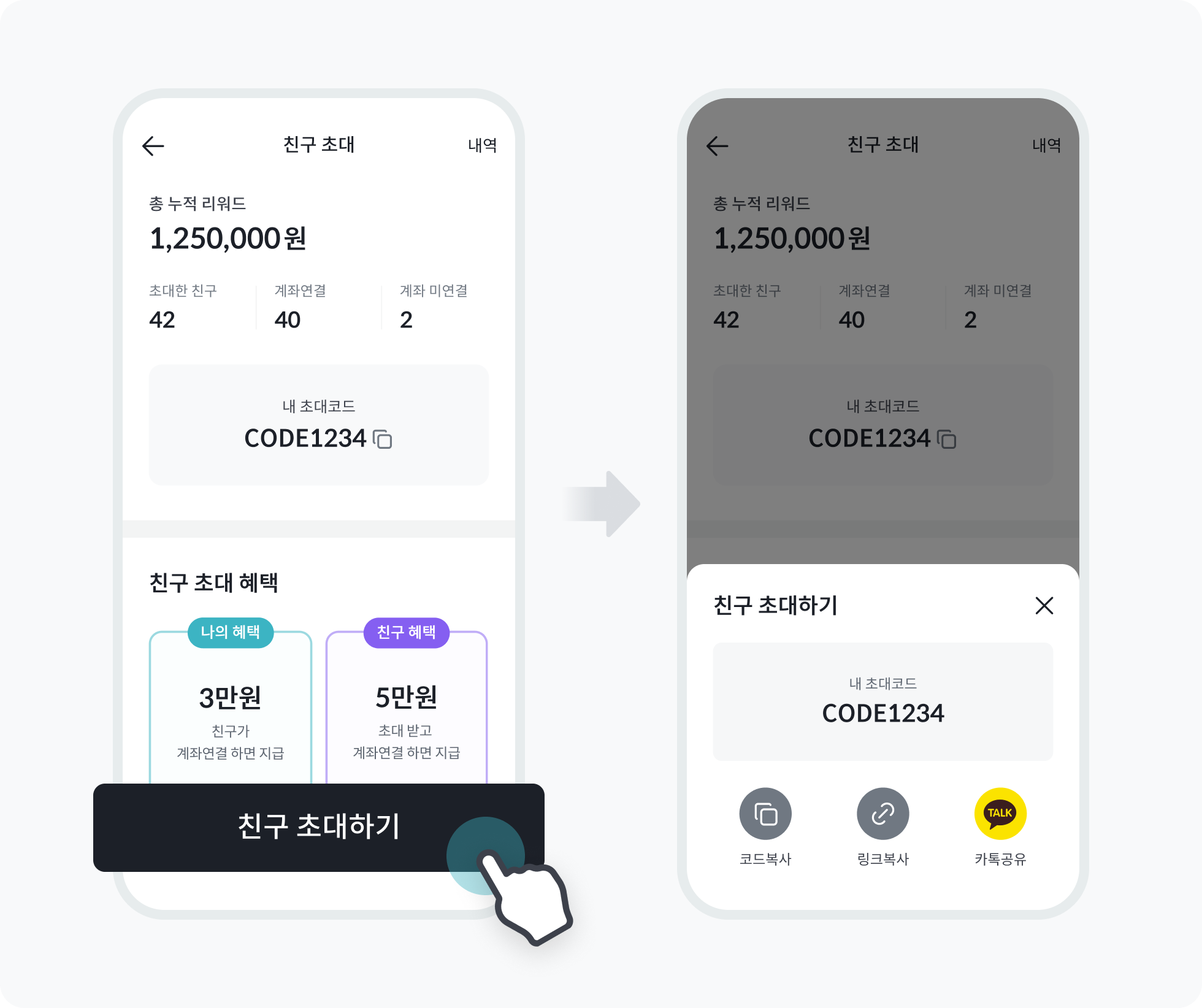 1. 빗썸 앱 [혜택/서비스] → [친구 초대] 메뉴에서 나만의 초대 코드를 생성