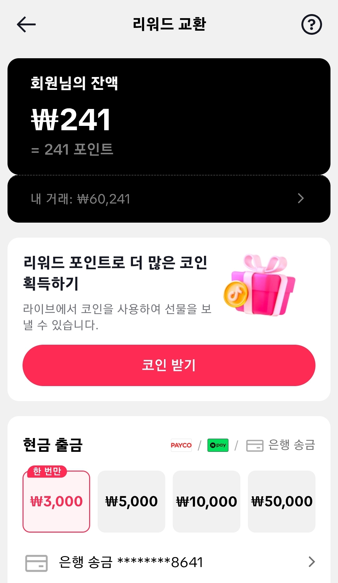주의사항은 현금 출금 시 출금할 수 있는 금액 단위가 3,000 / 5,000 / 10,000 / 50,000 이렇게 밖에 없어서 3만원의 경우 만원 단위로 출금 신청을 해주셔야 합니다.