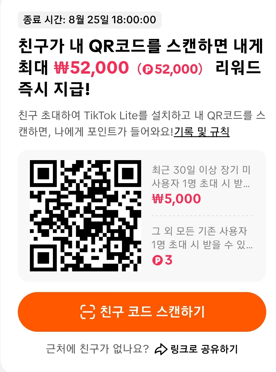 친구의 링크를 통해서 틱톡 라이트에 가입을 하면 친구와 가입자 모두 3만원의 리워드를 받을 수 있습니다.